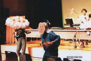 桃太郎、きじ、犬、さる、鬼の手作りお面をかぶり会場の皆さんの歌に合わせて演奏